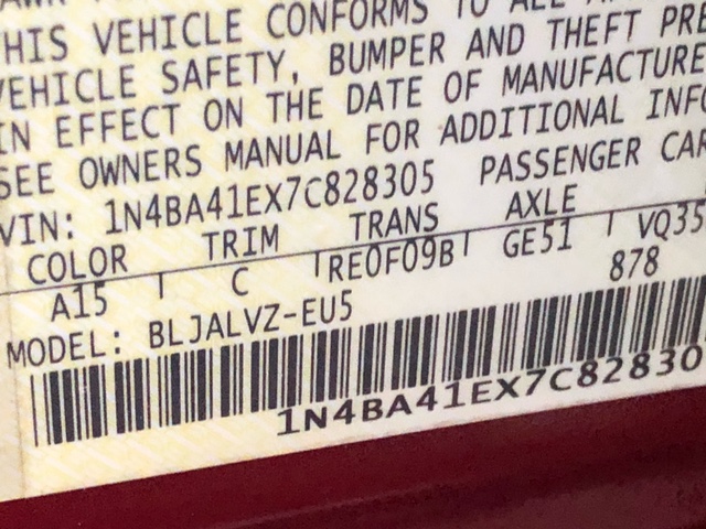 | VIN1N4BA41EX7C828305 | MakeNissan | ModelMaxima | Year2007 | TrimVariable